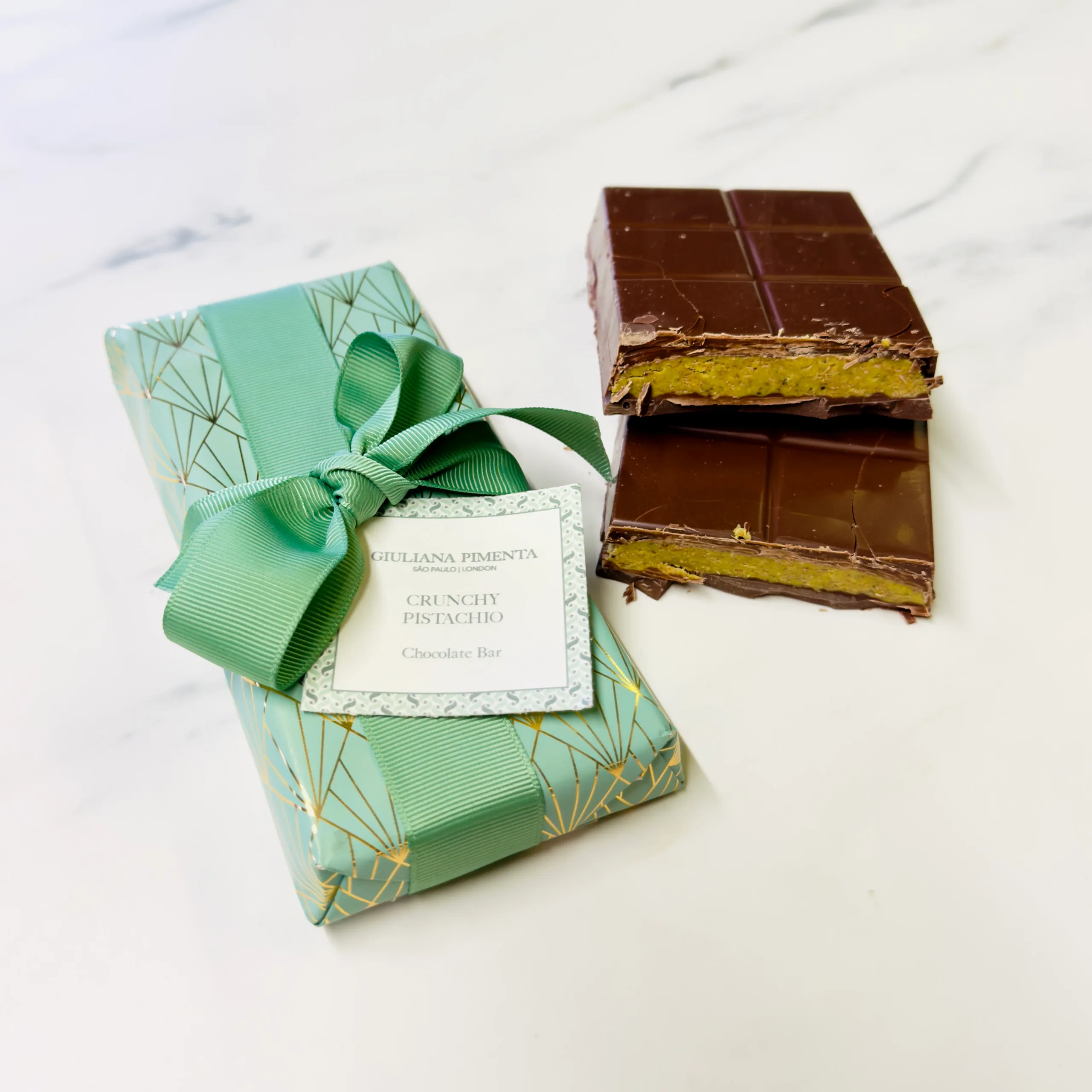Experience the perfect harmony of textures and flavours in our Crunchy Pistachio Chocolate Bar. Made with rich 41% milk chocolate and lavishly filled with crunchy pistachio ganache, crafted from real roasted pistachios and caramelised wafer for depth, crunch and authenticity.